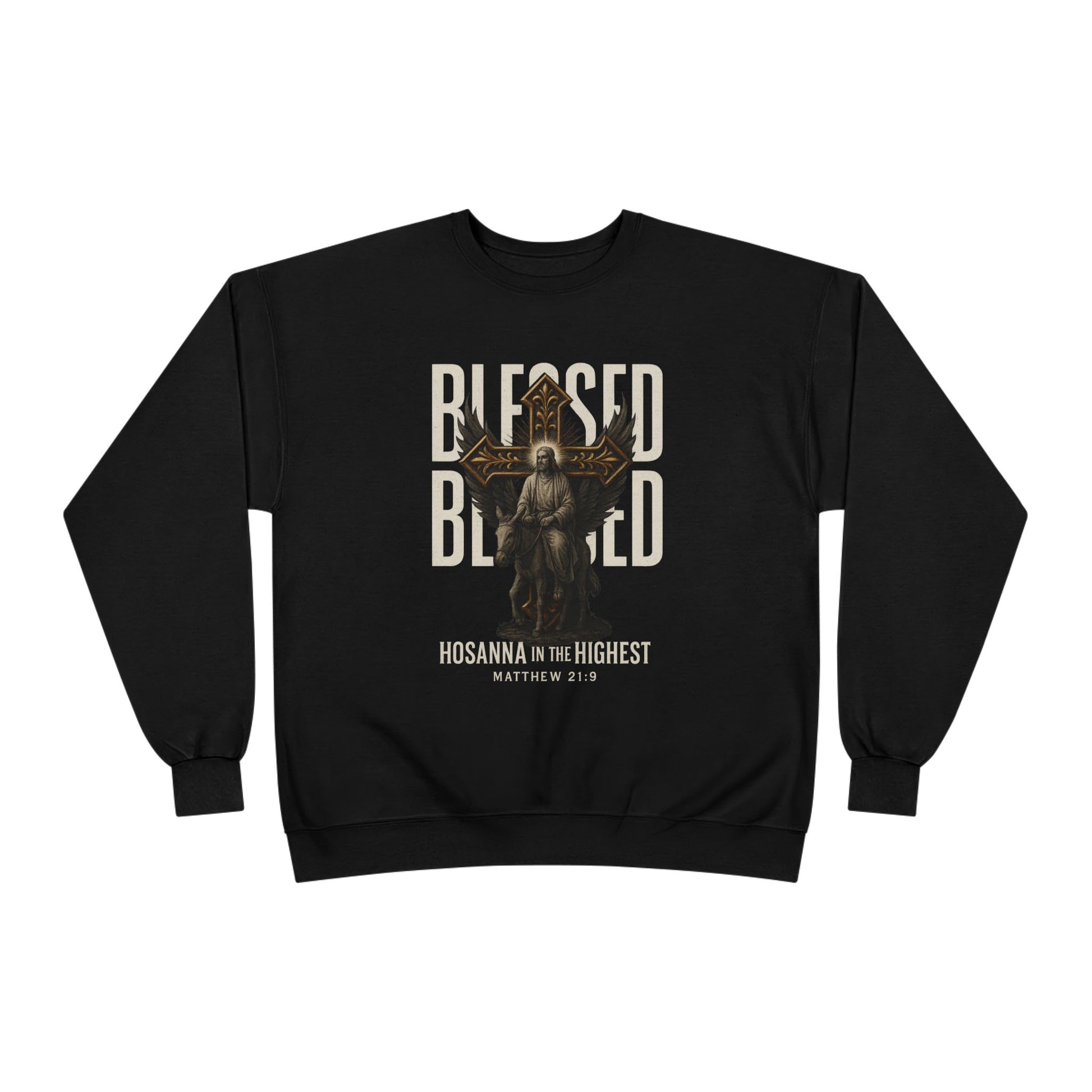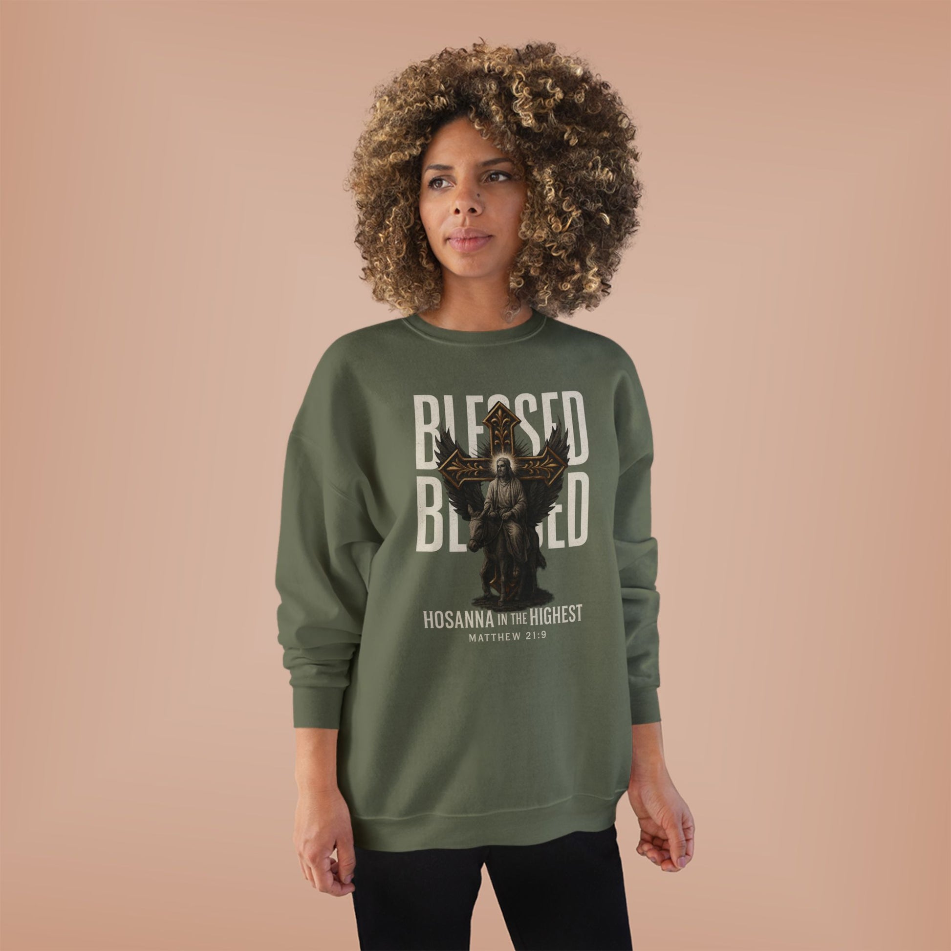 Grace meets grit in the BLESSED — Hosanna in the Highest crewneck. This design blends divine reverence with bold Mythic Iron energy — featuring a radiant depiction of Christ beneath the golden cross, framed by the word BLESSED in commanding gothic typography. Inspired by Matthew 21:9 — “Hosanna in the highest.”
