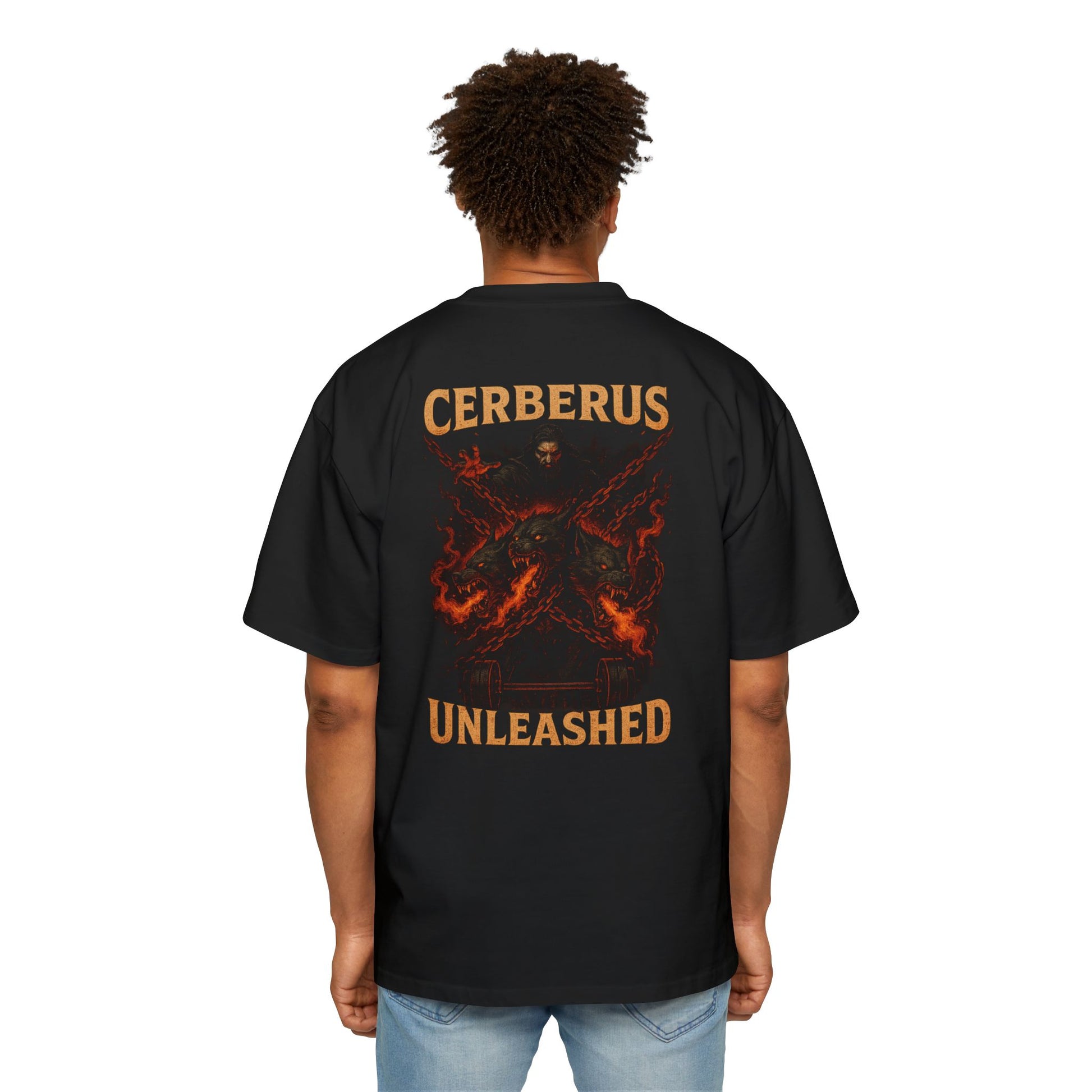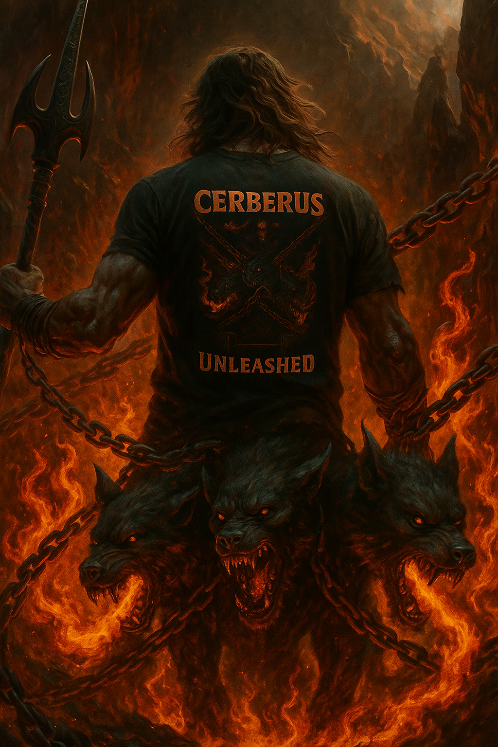 The three-headed guardian of the underworld, now unbound — with molten chains and hellfire flanking a battle-worn barbell.