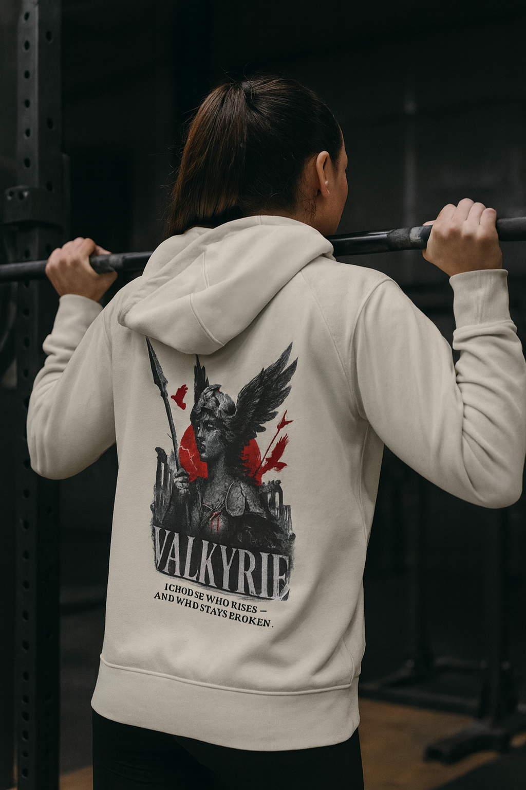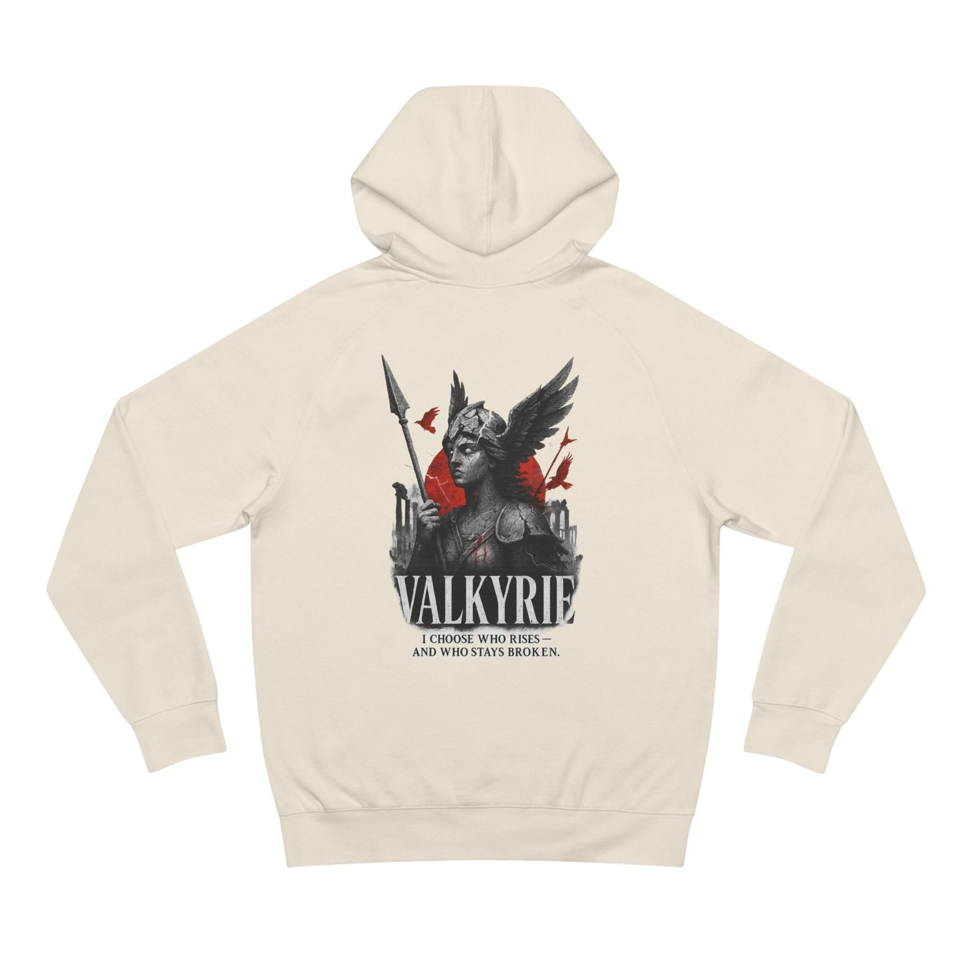 The Valkyrie Hoodie from Mythic Iron embodies the fierce judgment of the Norse warrior maidens who decide the fate of battle. Featuring a brutalist stone-carved Valkyrie bust with winged helm and spear, framed in crimson with shattered ruins at her back.